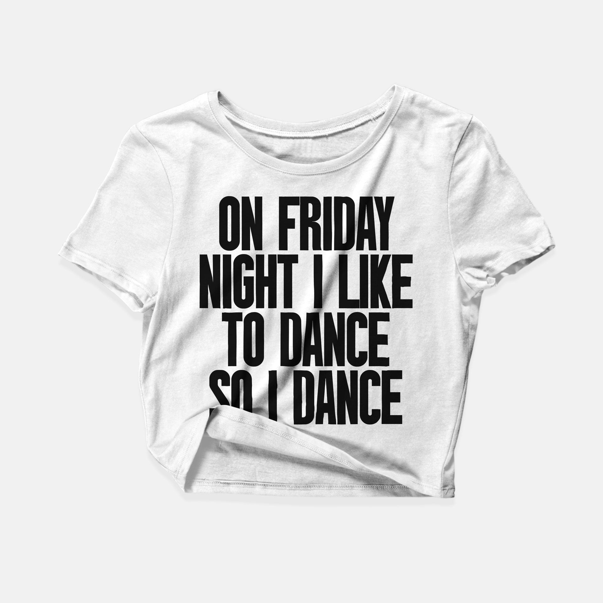Ikonisches Oversize Crop Top mit kultigem Statement-Print "On Friday Night" aus 100% Baumwolle. In Schwarz oder Weiß.